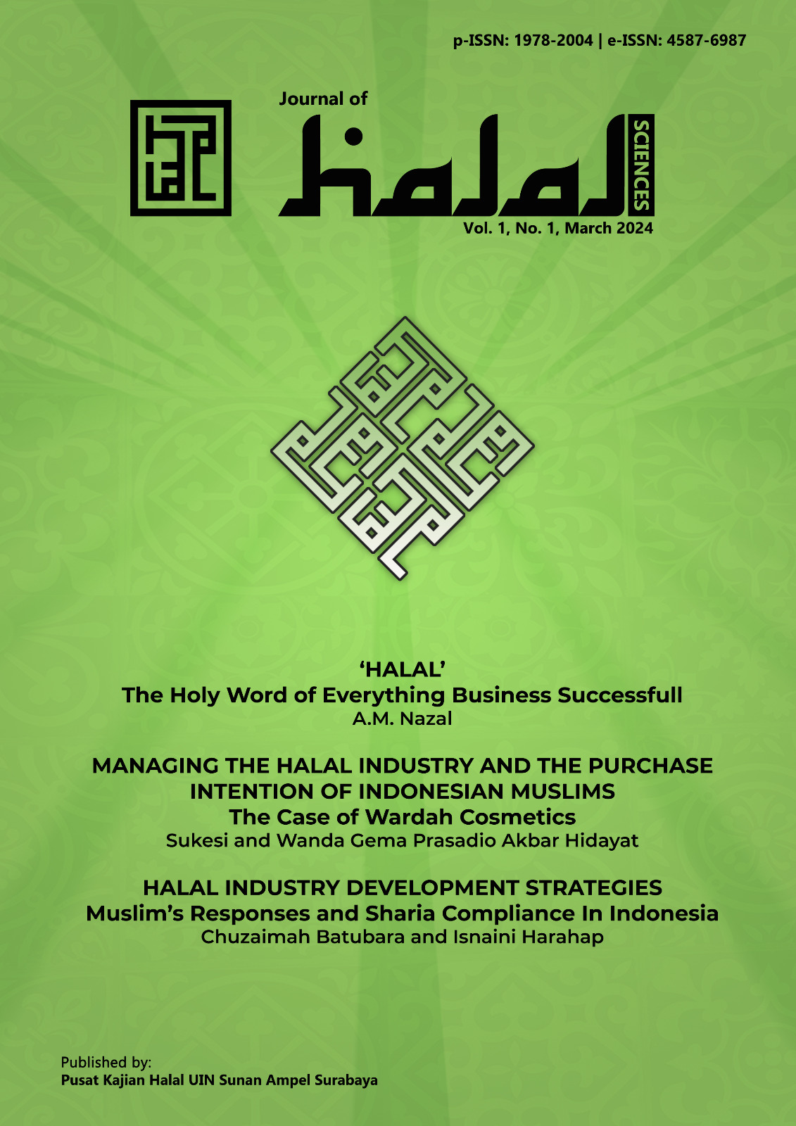Journal of Halal Sciences (e-ISSN 3064-4593 and p-ISSN 3064-3988) is a multi-disciplinary publication dedicated to scholarly study on halal as a cross cutting issue. Particular attention is paid to attitudes and practices of Muslims on halal issues, halal products (food, cosmetics, fashion and arts), halal services (medicine, tourism, education, and lifestyle), halal sciences and other cross cutting issues related to halal. The journal tries to locate the halal issues as the main attention of academic inquiry and to endorse comprehensive studies. In addition, the journal also promotes conversation and discussion of halal cross cutting issues. Thus, the journal invites researchers, academics, scientists, policy makers, and practitioners from all over the world to exchange thoughts and insights and to disseminate ideas, research findings, practices and experiences on the issue. The journal will be published twice in a year, every March and September. It is published by Halal Center of UIN Sunan Ampel Surabaya.